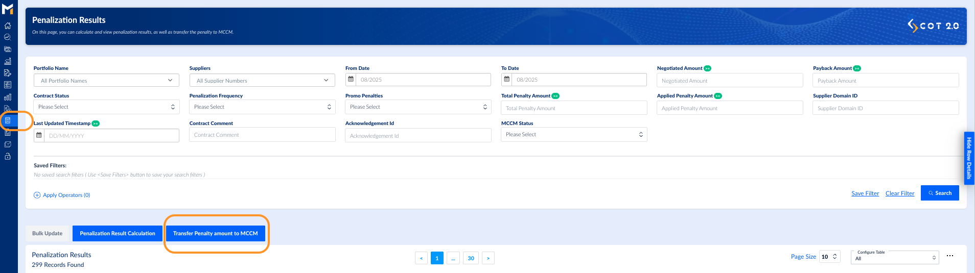 To transfer calculated penalties to MCCM, go to the Penalization Results section in SCOT.