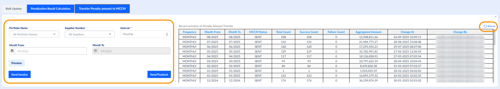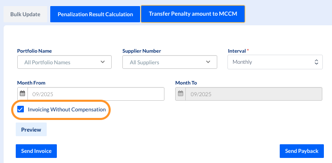 This will expand a new section where you can select the specific penalty information that you want to send to MCCM for invoicing. You can select specific portfolios, supplier numbers, interval and period.