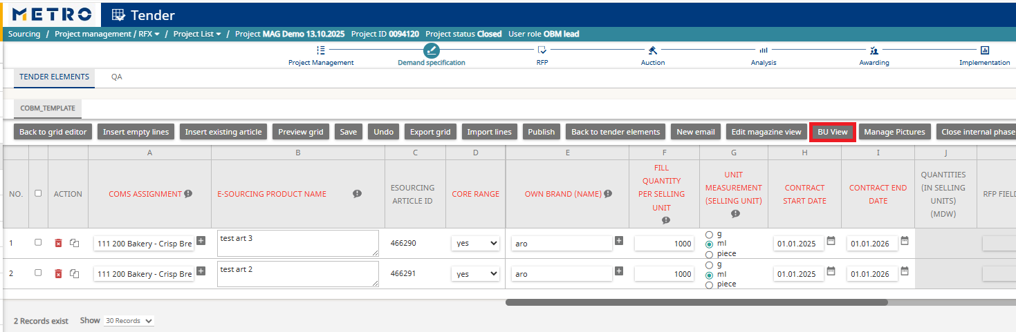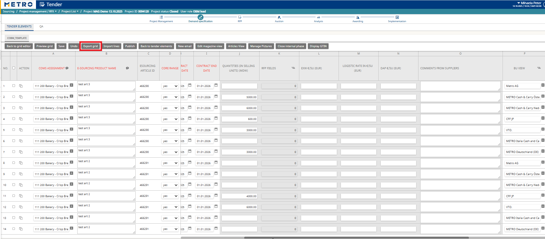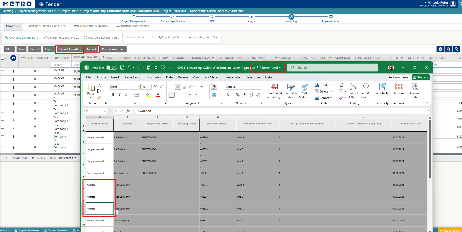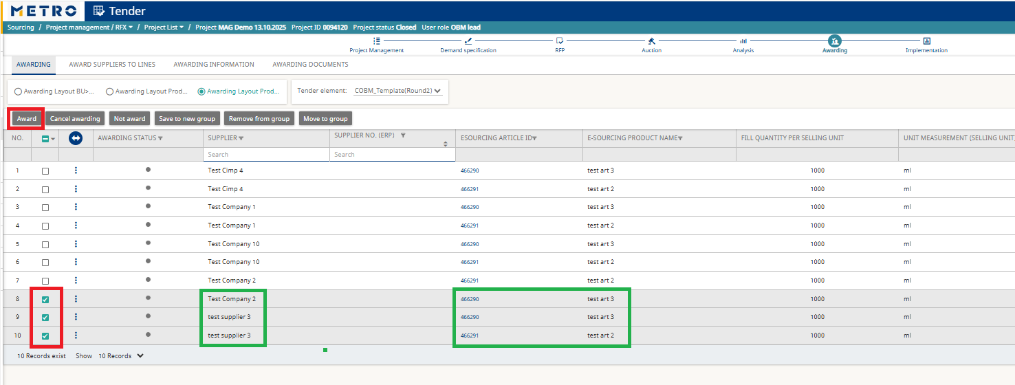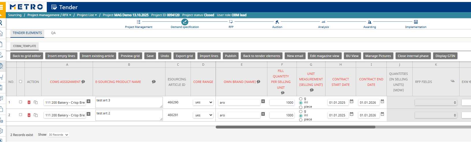 - Delete articles that will not be awarded - from the original grid (Tender Elements → Previewer on Grid 1 → Delete).