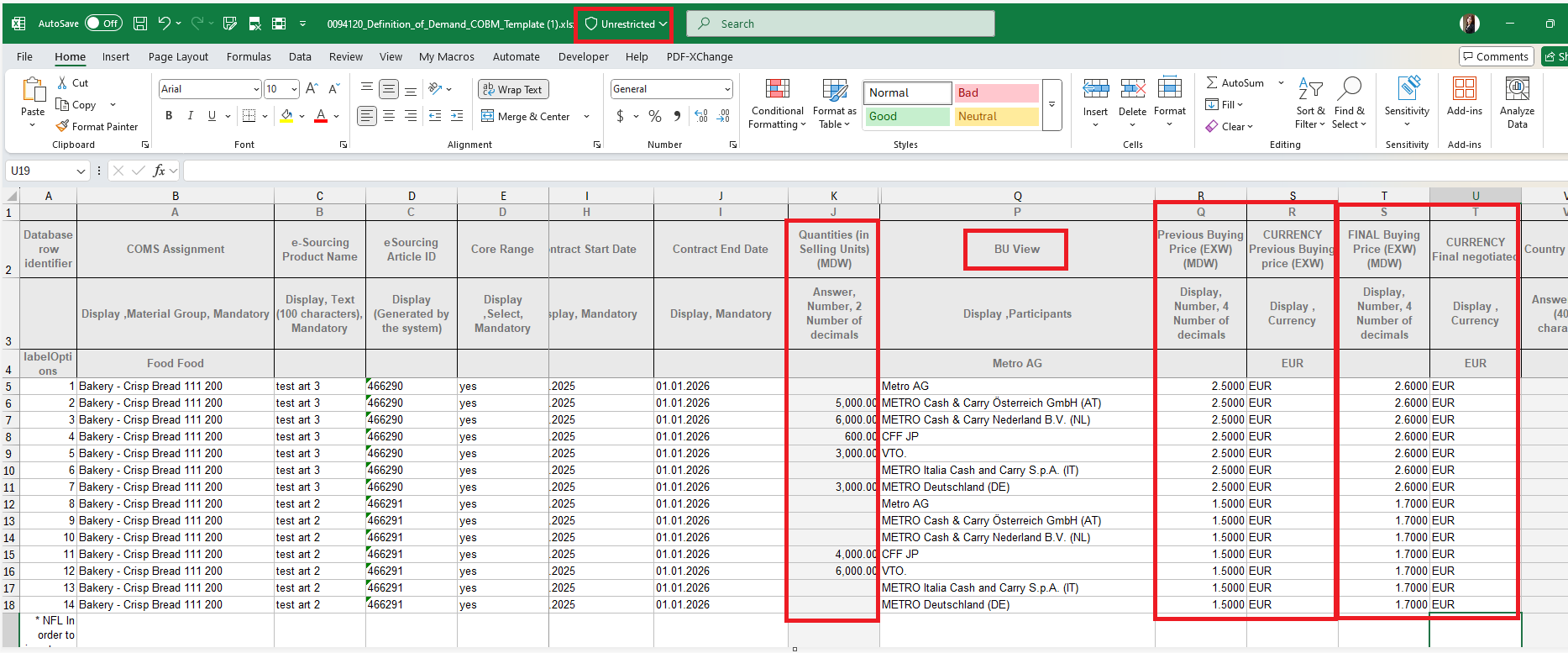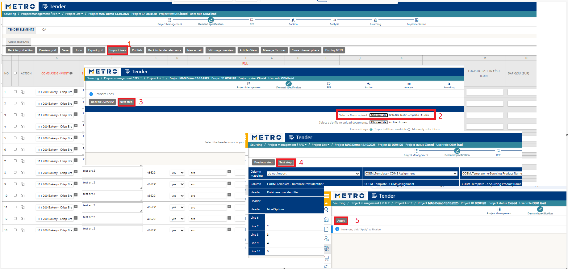 - Go to eSourcing → Demand Specification → Edit Line Items → BU View → Import Lines.