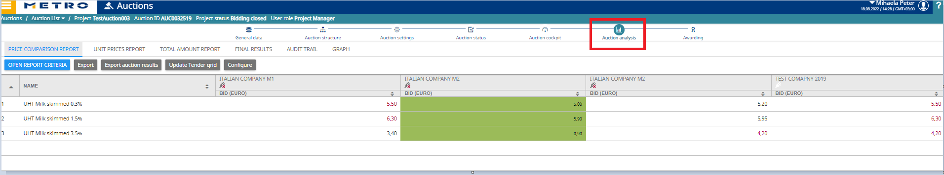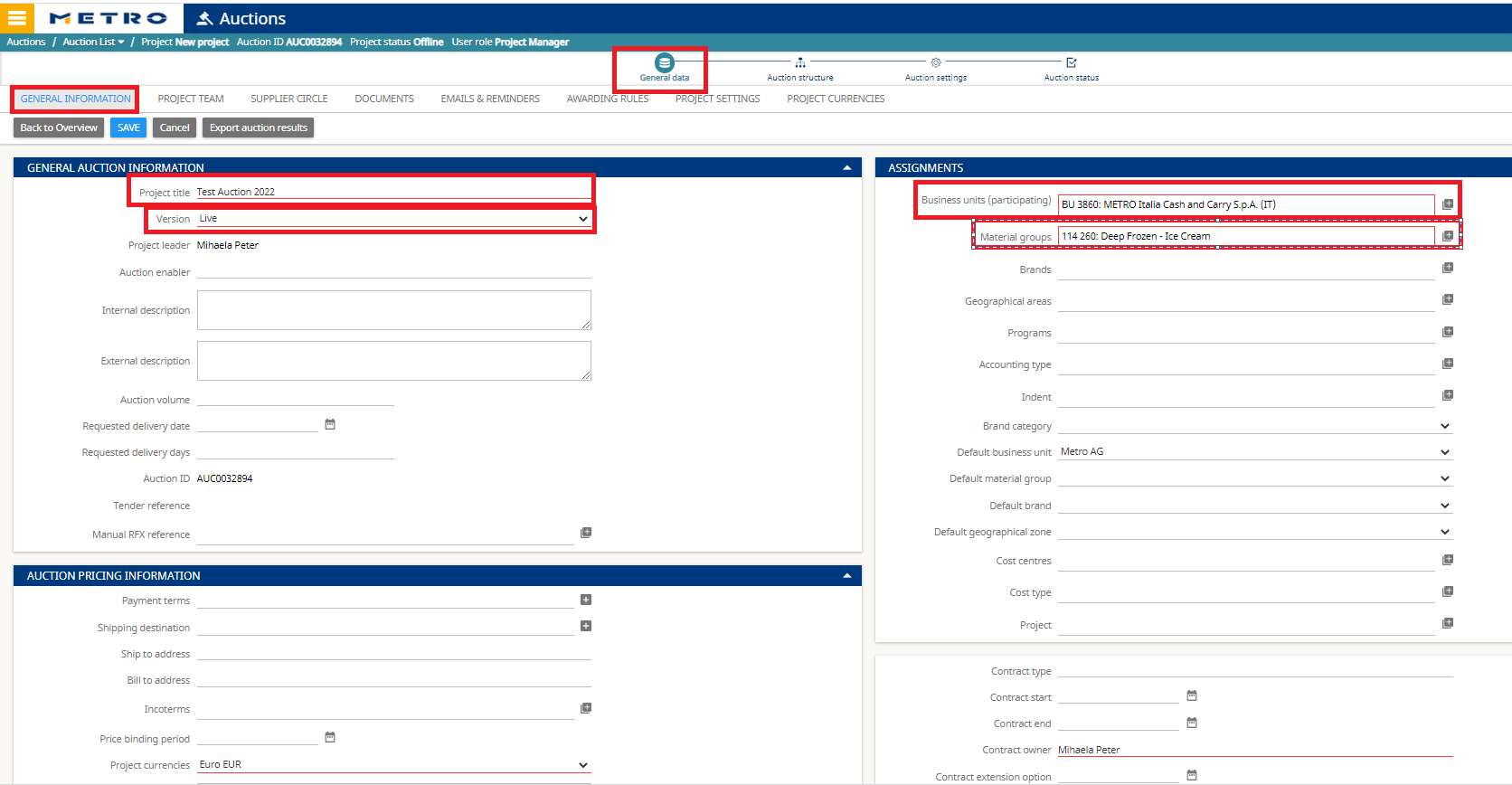 - Enables awarding: Awarding is recognized by downstream systems (e.g., MDW) only when it is executed from the originating RFX project linked to the auction.