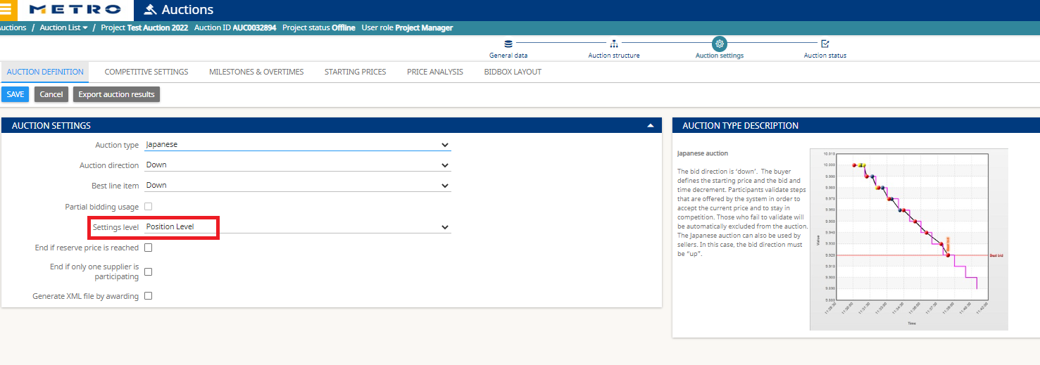 This guide provides a complete, step‑by‑step walkthrough for setting up a Japanese auction in eSourcing. You pre‑configure the start price, the time step (tick interval), and the price step (decrement). At each time step, the system automatically lowers the price by the configured step. Suppliers must confirm/accept the displayed price at every tick to remain in the competition for the current article; those who do not confirm are automatically out.