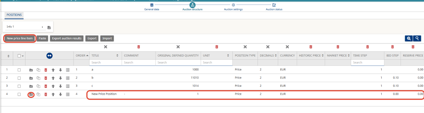 - If the auction was created as standalone (not from an RFP/RFX), use New price line item to create positions (articles).