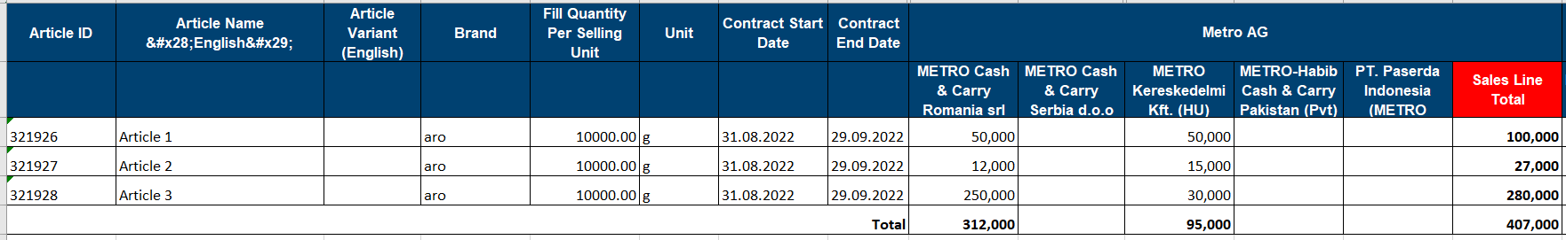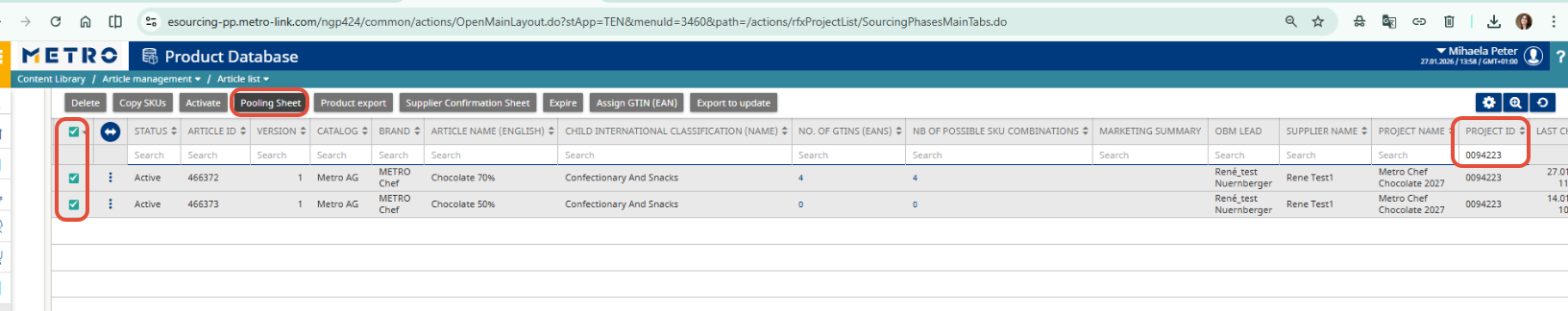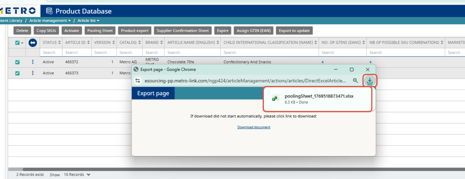 This guide explains how to quickly export article quantities by country from the Article List in eSourcing. Follow the steps below to access the list, select the relevant articles, and download the Pooling Sheet report.